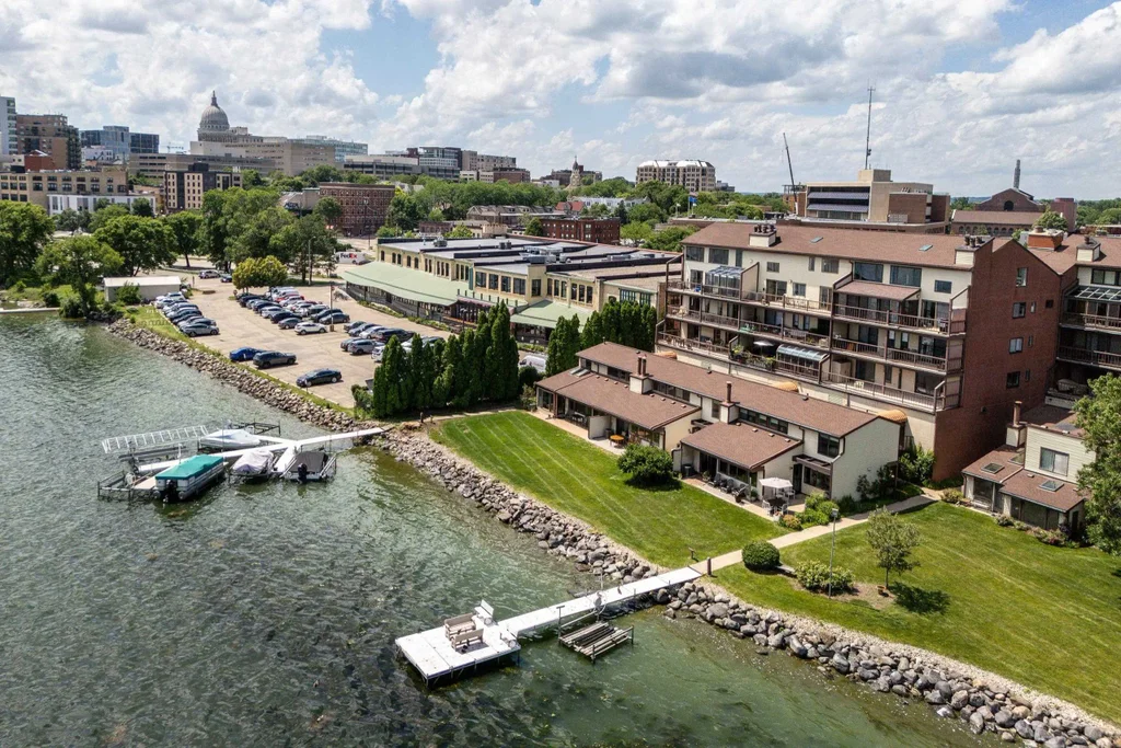 Luxury lakefront living in the heart of downtown Madison. This coveted corner unit at the Fauerbach Condos offers 2 beds, 2.5 baths, and stunning Lake Monona views. Just steps from Capitol Square, enjoy a lifestyle of culture and convenience. The main level features a spacious living room with fireplace and walkout to the lake, dining area with patio access, and a sleek kitchen with black stainless appliances, white cabinetry, black countertops, and gray subway tile. Stylish, modern lighting throughout. Upstairs offers two large en suite bedrooms with walk-in closets and custom systems. Includes parking spaces 27 + 28, plus storage and private entrance into the unit.