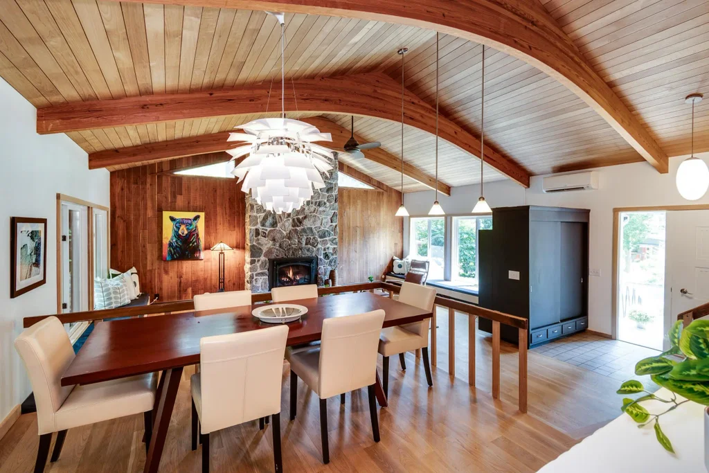 This mid-century modern residence offers a coveted location, with Hoyt Park seamlessly extending from the backyard. Distinctive architecture showcases soaring vaulted ceilings with walnut paneling + a gas fireplace with an elegant fieldstone surround in the main living + dining areas. The chef’s kitchen features generous custom Puustelli cabinetry and ceramic counters, Sub-Zero fridge + freezer, white oak floors and a Jutul fireplace in the sunlit dinette perfect for hosting family + friends. The primary suite boasts a private bath, walk-in closet, custom sauna plumbed with a shower + direct deck access. Spacious bedrooms provide ample storage, while the main bath offers a double vanity. The lower level includes a recreation room + guest suite.